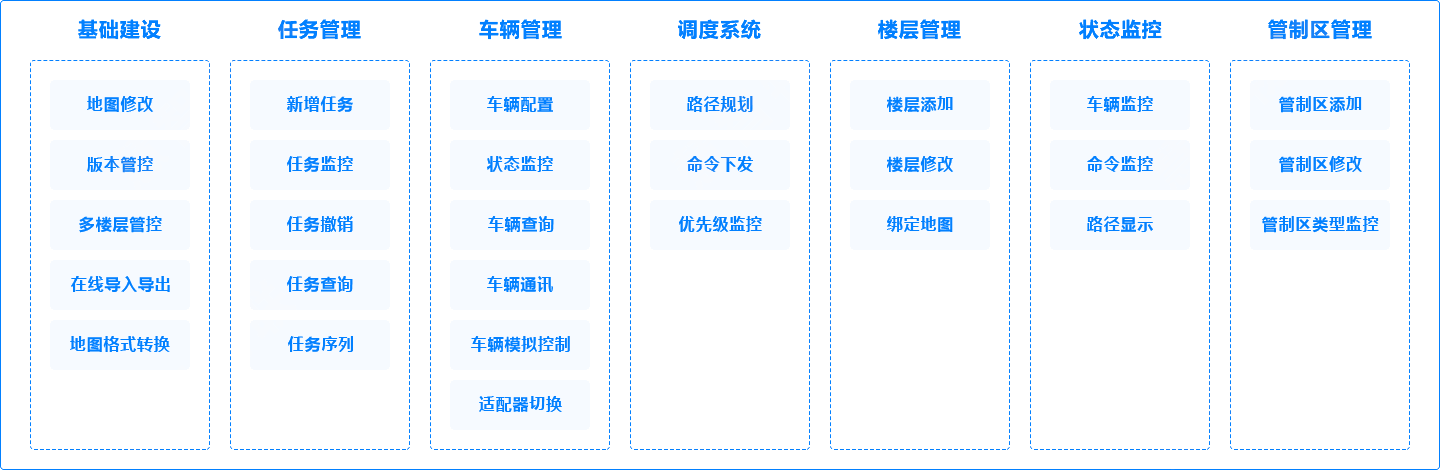 可统一管理移动机器人及工厂自动化物流设备的新一代调度系统。协同规划,智慧调度。通为客户快速搭建应用场景提供高效方案,助力企业智能制造转型升级,自动化生产,自动搬送车辆控制系统提供7大功能模块支撑工厂进行自动化流程生产推进。